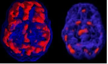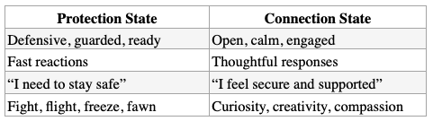 The image on the left is a brain stressed out in protective mode, the brain on the right is a brain in connection mode.